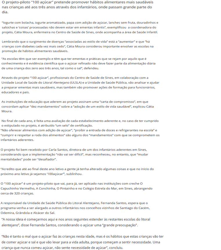 Escolas de Sines laçam projecto 100 Açúcar