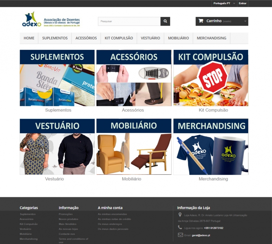 Este espaço está disponível online, no nosso site oficial www.adexo.pt., onde pode encontrar desde roupas de homem e senhora em tamanhos grandes a acessórios, tais como extensores de cintos de segurança, atacadores elásticos, calçadeiras longas, vitaminas para bariátricos, mobiliário e equipamentos ergonómicos, para além de kits de compulsão alimentar, etc..