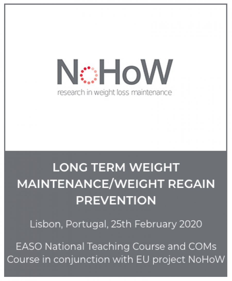 A EASO - Associação Europeia para o Estudo da Obesidade, em conjunto com a SPEO - Sociedade Portuguesa de Estudo da Obesidade, o Hospital dos Lusíadas em Lisboa, a ADEXO - Associação de Doentes Obesos e Ex-Obesos de Portugal e NoHoW, tem o prazer de convidá-lo a participar de um curso Internacional de ensino e COMs (Centros de Gestão da Obesidade) sobre Gestão de peso a longo prazo.