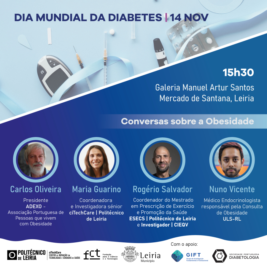 Para assinalar o Dia Mundial da Diabetes, o ciTechCare irá promover uma sessão dedicada à literacia em diabetes, com enfoque particular na Obesidade, a convite da Sociedade Portuguesa de Diabetologia (SPD), em particular e do Grupo de Investigação Fundamental e Translacional (GIFT), que terá lugar no dia 14 de novembro, pelas 15h30, na Galeria Manuel Artur Santos - Mercado de Santana, em Leiria.